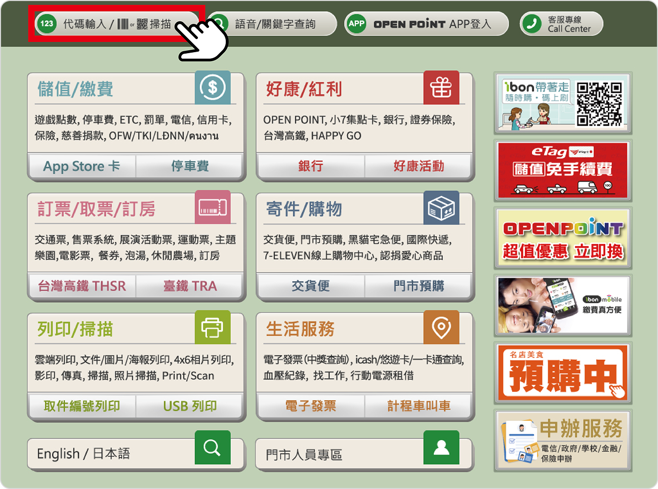 步驟七、到7-11 ibon機臺選擇代碼輸入/掃描